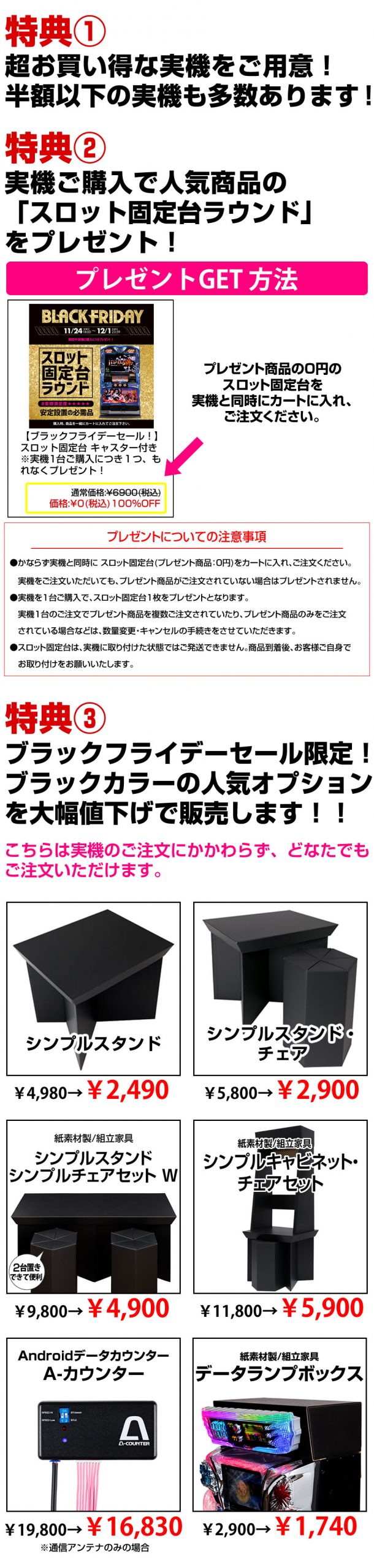 セール情報 セール 【11月24日(金)18:00スタート!】ブラックフライデーセール開催します!! 2023年11月22日 2023年11月22日 Twitter Tweet いつもA-SLOT オンラインストアをご利用いただきありがとうございます。 セール開催のお知らせです! 年に一度のビッグセール! ブラックフライデーセール!開催します🥳 商品はただいま準備中! 最新人気機種やスマスロも販売予定ですのでお楽しみに🎵 どうぞよろしくお願いします‼ 関連記事: 春のSUPER SALEを開催します!実機SUPER SALE9,800円~!開催期間: 4/7[金] 18:00~4/12[水] 23:59 【本日最終日!】A-SLOT春のスーパーセール開催中です!🌸 GW直前スペシャルセール!激熱価格7,770円~夢の実機GETの大チャンス! サマーセール本日18時スタート!遅くなりましたが本日商品公開します! Twitter
